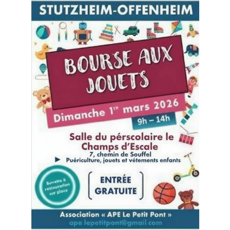 L'association des parents d'élèves "ape le petit pont" de stutzheim-offenheim organise une bourse aux jouets, vêtements d'enfants et articles de puériculture, le dimanche 1ier mars 2026 de 09h à 14h. A la salle du périscolaire le champs d'escale 7, chemin de la souffel 67370 stutzheim-offenheim entrée gratuite pour les visiteurs. Petite restauration sur place. Bourse de 09h à 14h.