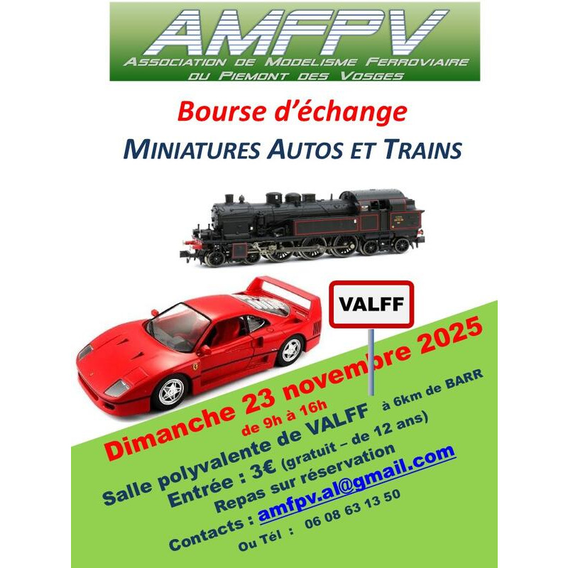 Amateurs de miniatures autos et trains, rendez-vous à la salle polyvalente de valff le 23 novembre prochain. Organisée par l'amfpv (association de modélisme ferroviaire du piémont des vosges) cette bourse réunira plus de 30 exposants de 9h à 16h. Vous y trouverez des centaines de véhicules miniatures de diverses échelles, des trains miniatures et des éléments de décor ; une bourse diversifiée qui ravira les collectionneurs et les « petits et grands enfants ». Entrée 3€, gratuit pour les enfants de moins de 12 ans. Bar et restauration sur place. A midi repas chaud : noix de jambon, frites, crudités, dessert, café au prix de 14€ sur réservation ou par mail