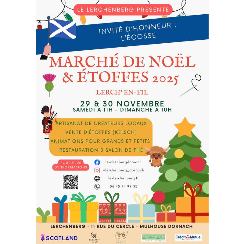 Le lerchenberg vous invite à découvrir son marché de noël d'artisanat local qui aura lieu le week-end du 29 et 30 novembre, au 11 rue du cercle à mulhouse, le samedi de 11h à 19h et le dimanche de 10h à 17h. Profitez également d'animations autour de noël ainsi que de la mise à l'honneur de l'ecosse tout au long du week-end.