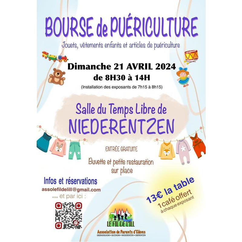 L'association de parents d'élèves le fil de l'ill organise une bourse à la puériculture et aux jouets, le dimanche 21 avril 2024, à la salle du temps libre de niederentzen (au croisement entre la rue principale et la route de rouffach).