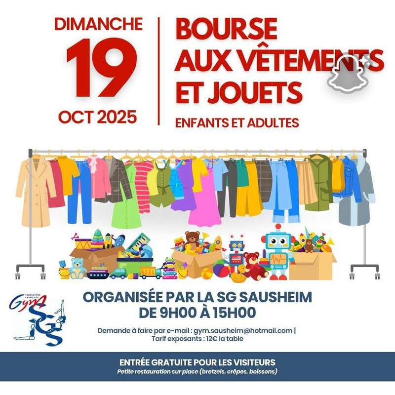 Bourse aux vêtements & jouets – enfants & adultes dimanche 19 octobre 2025 de 9h à 15h 8a rue de mulhouse 68390 sausheim