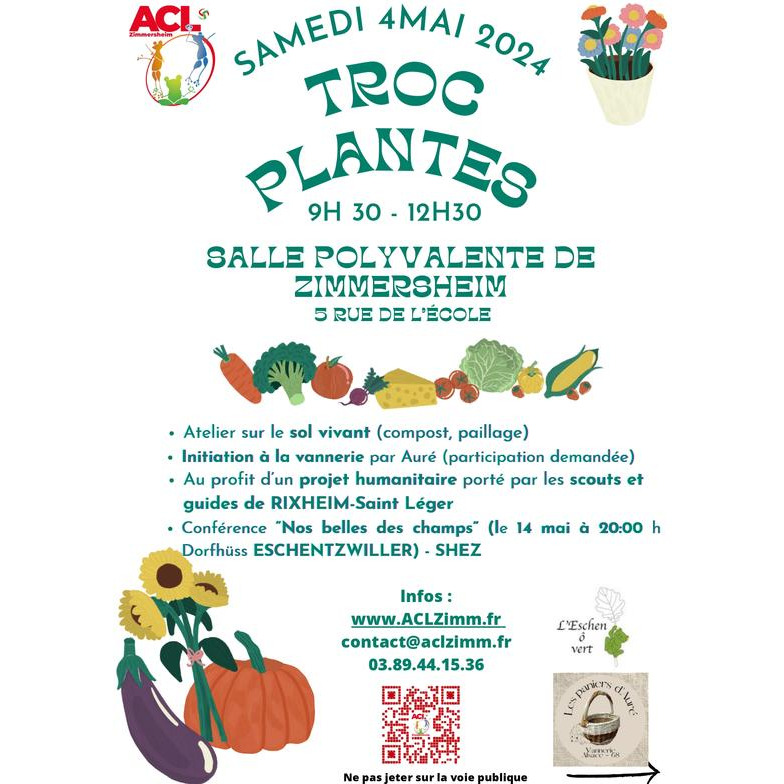 L'association culture et loisirs de zimmersheim organise le samedi 4 mai 2024 de 9 h 30 à 12 h 30, dans la salle polyvalente (5 rue de l'école), un troc plantes-vide jardin, ouvert à tous.