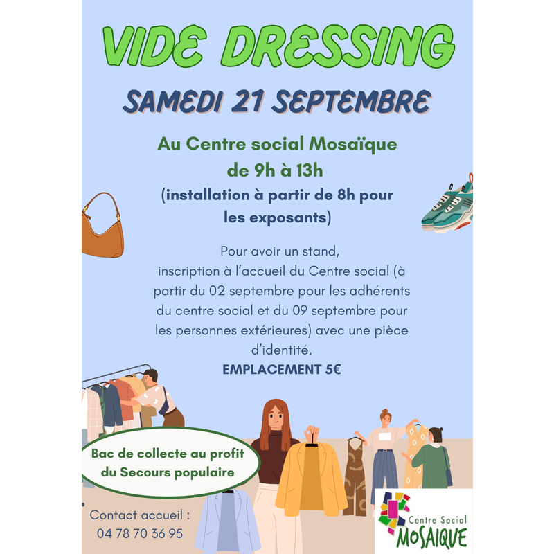 Vide dressing dans la cour du centre social. En cas de mauvais temps, l'évènement aura lieu à l'intérieur. Vêtements femme, enfant, homme.