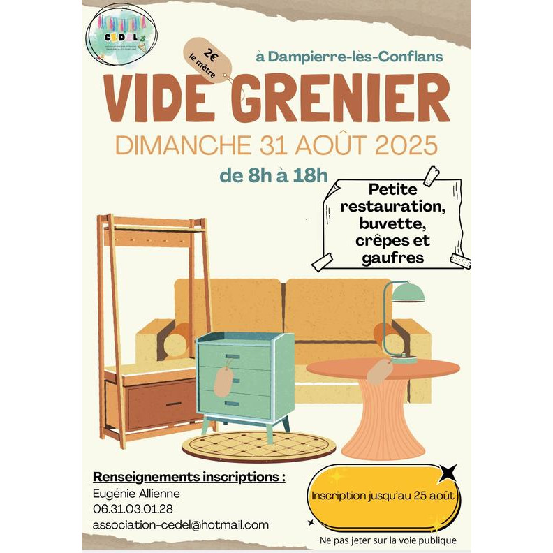 Vide grenier organisé par le cedel de dampierre les conflans. Petite restauration, buvette, gaufres.