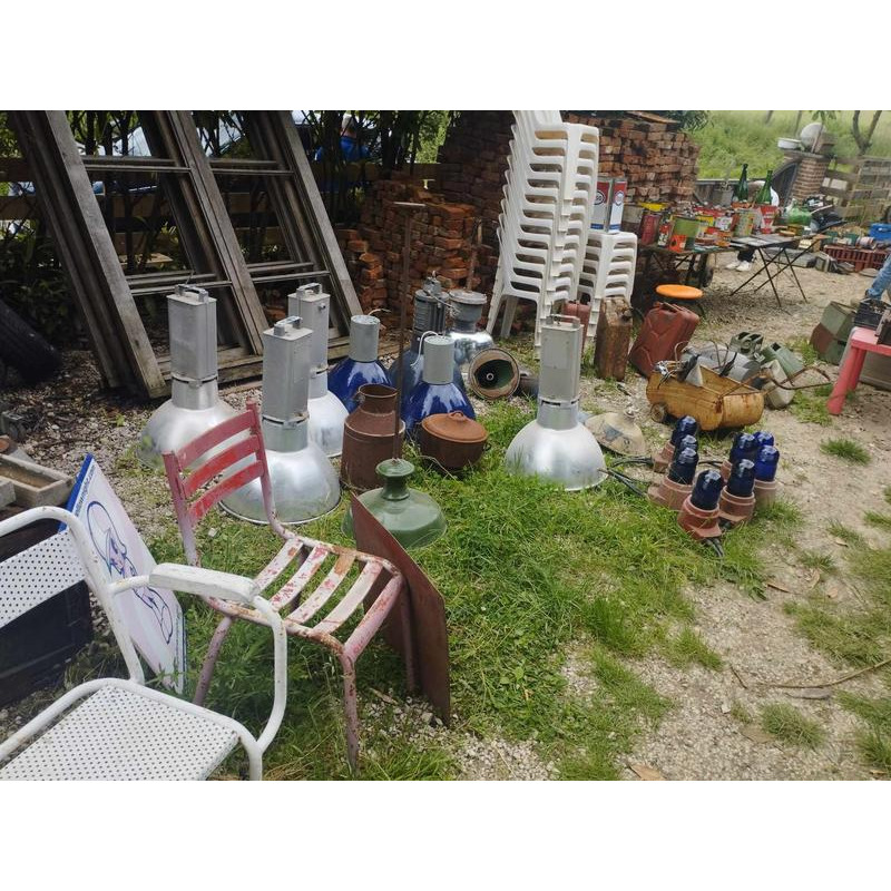 Pleins d'objets divers, vieux bidons huile, vieilles vaisselle, dames jeannes, petits meubles, petites voiture en boites d'origine, bibelots, objets anciens, lampes et beaucoup d'autres choses.