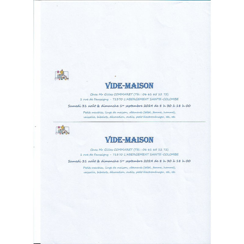 Vide-maison chez particulier, petits meubles, linge de maison, vêtements, vaisselles, bibelots, outillages, petits électroménager, etc....Etc....