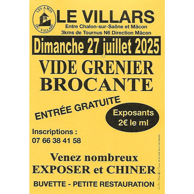L’association les amis du villars organise sa 3ème brocante après la fin de la covid et se tiendra le dimanche 27 juillet 2025 de 6h à 20h sur la place de l’église du village – situé à 3 km au sud de tournus.