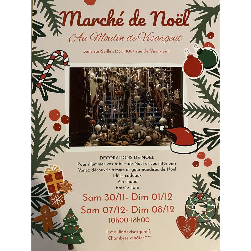 Marché de noël au moulin, vente de décorations et gourmandises de noël.