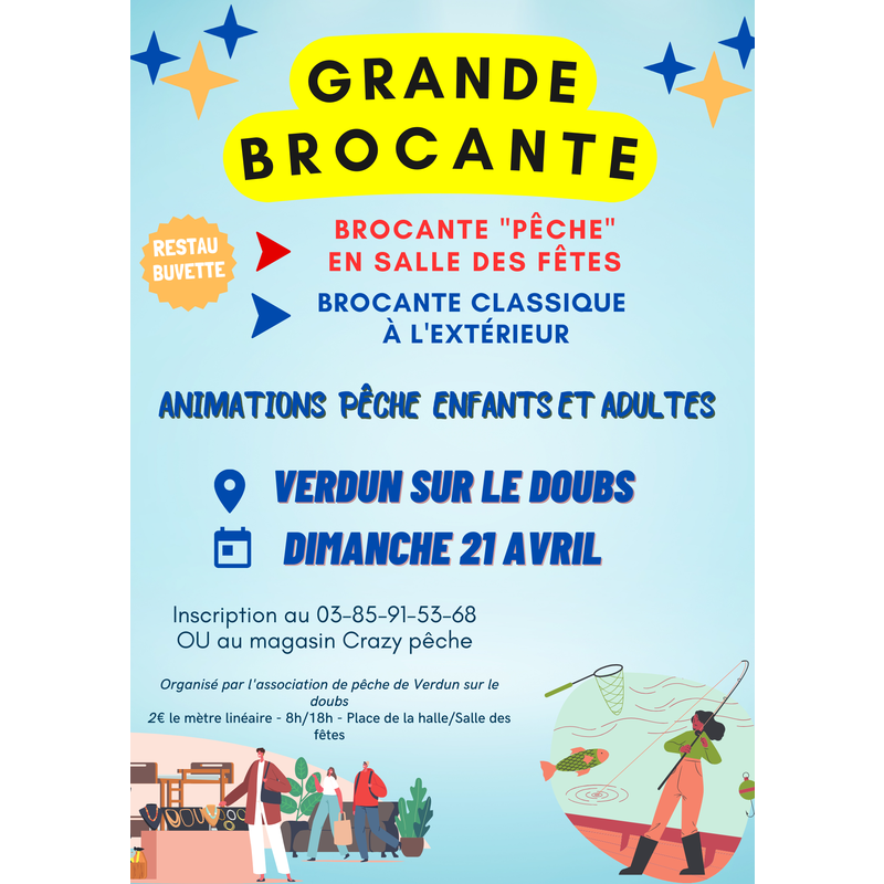 Dimanche 21 avril 2024 de 08h00 à 18h00 (grande brocante + brocante pêche : brocante classique à l'extérieur +" brocante pêche" en salle des fête