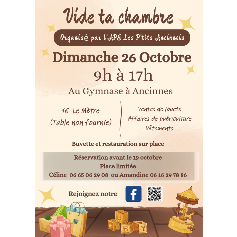 L'association des parents d'élèves organise son 2eme vide ta chambre, vente de jouets, matériel de puériculture, vetement bébé, enfants, ados .
