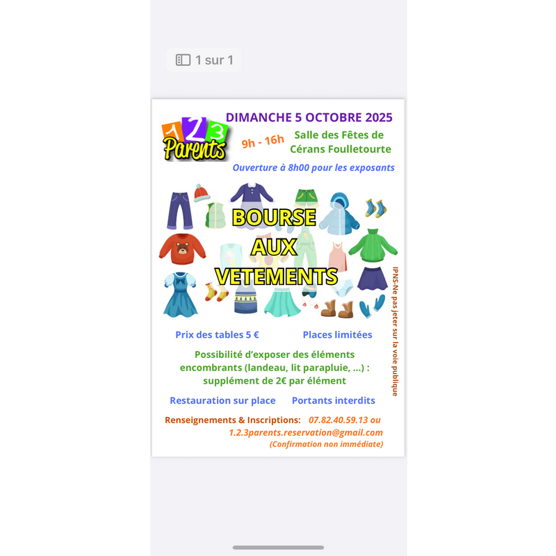 Bourse aux vêtements et aux jouets organisée par l’association 1,2,3 parents au profit des trois écoles du village ouverte aux visiteurs de 9h à 16h le dimanche 5 octobre 2025.
