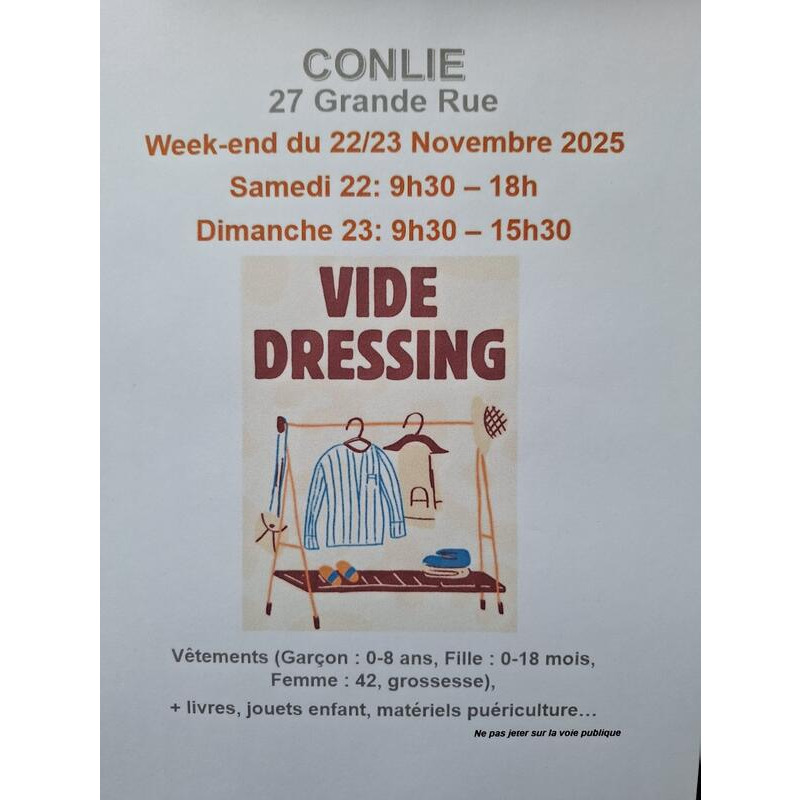 Vide dressing proposant vêtements enfants garçon 0/8 ans et vêtements fille 0/18mois ; grossesse 42 ; chaussures enfants ; matériel puériculture ; jouets ; livres ; décoration ; etc...