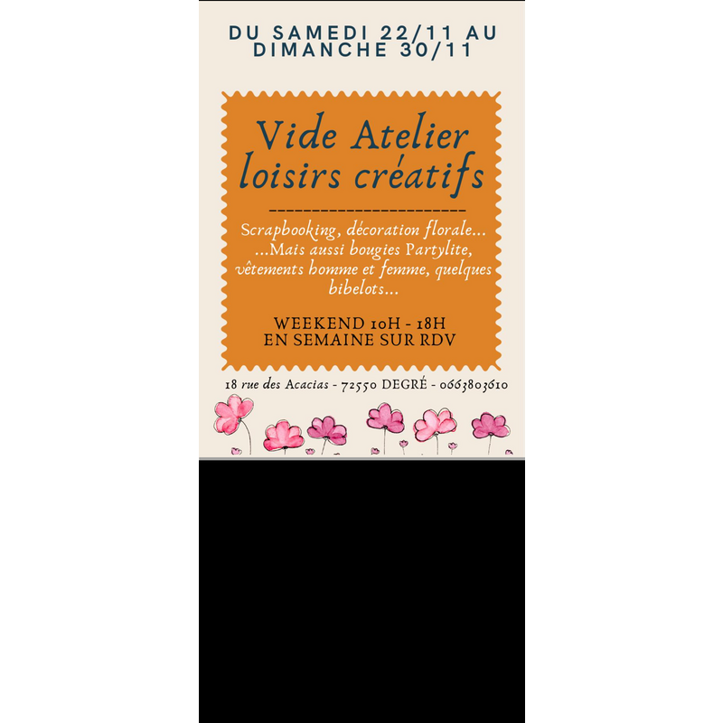 Vide atelier loisirs créatifs, décoration florale, vêtements femme et homme, bougies partylite, divers bibelots, etc.