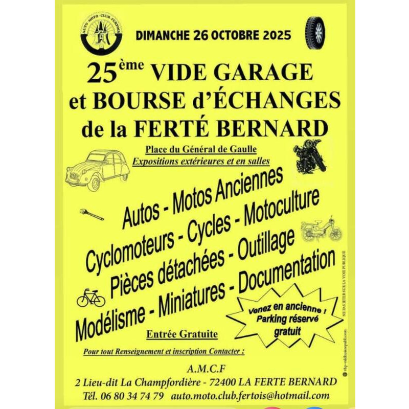 Bourse auto-moto - La Ferté-Bernard 8h à 17h inscription obligatoire Salle 1 avec tables : 14€ la table de 1.80m X 0.80m Salle 2 sans table : 6€ le mètre linéaire Extérieur 4€ le mètre linéaire sur 5 mètres de profondeur