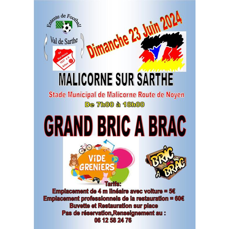 Grand bric a brac annuel autour du stade de malicorne, restauration sur place.