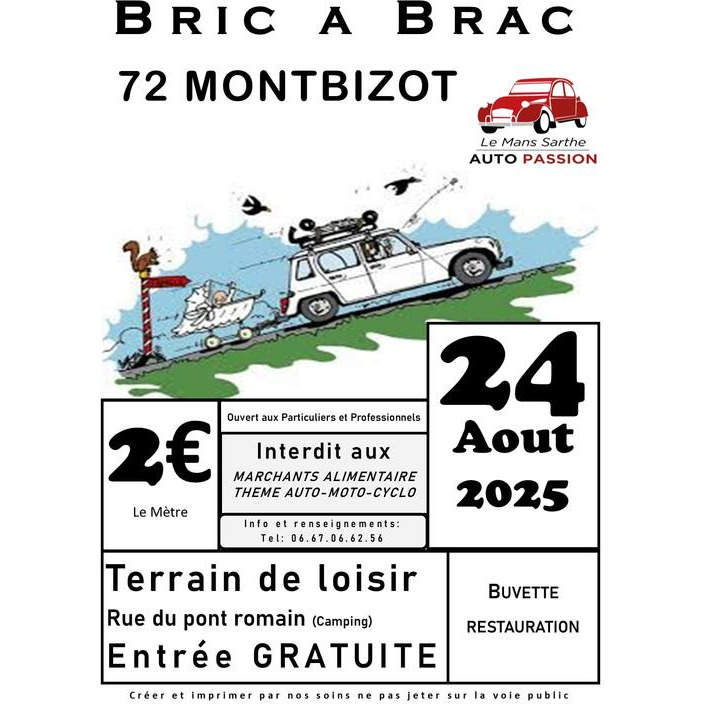 L'association accueilles les exposants du bric a brač a partir de 6h jusqu'à 8h du matin sur le terrain de loisir sans réservation. Avec un minimum de 5 m pour installer le véhicule derrière le stand.