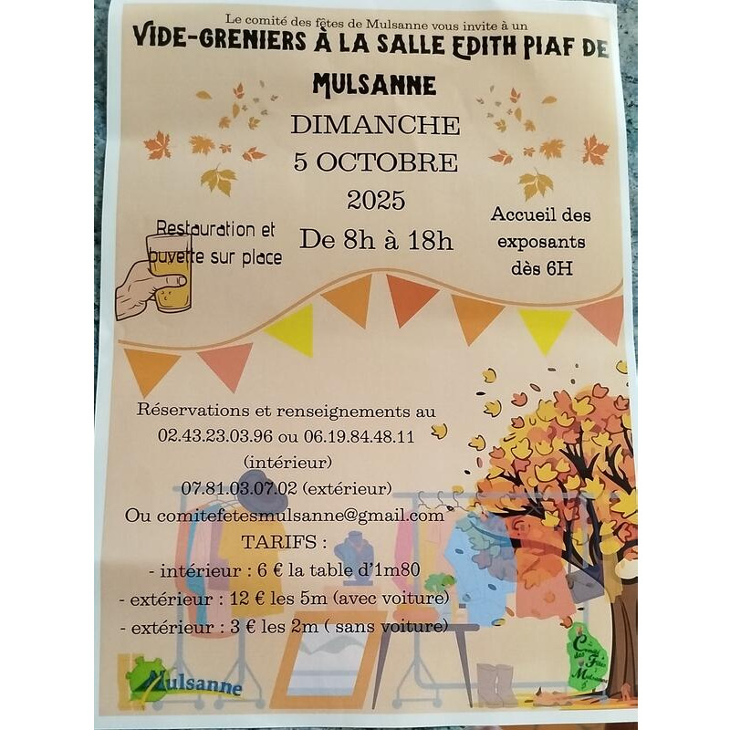 Le comité des fêtes de mulsanne organise son vide greniers annuel. Ouvert dès 8 h 00 pour les visiteurs.