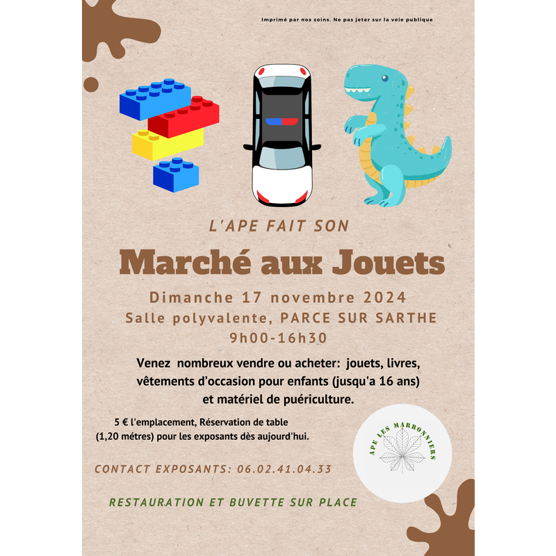 L'ape les marronniers organise son célèbre marché aux jouets. Vous trouverez d'occasion jeux, jouets, matériel de puériculture et vêtements enfants (jusqu'à 16 ans).