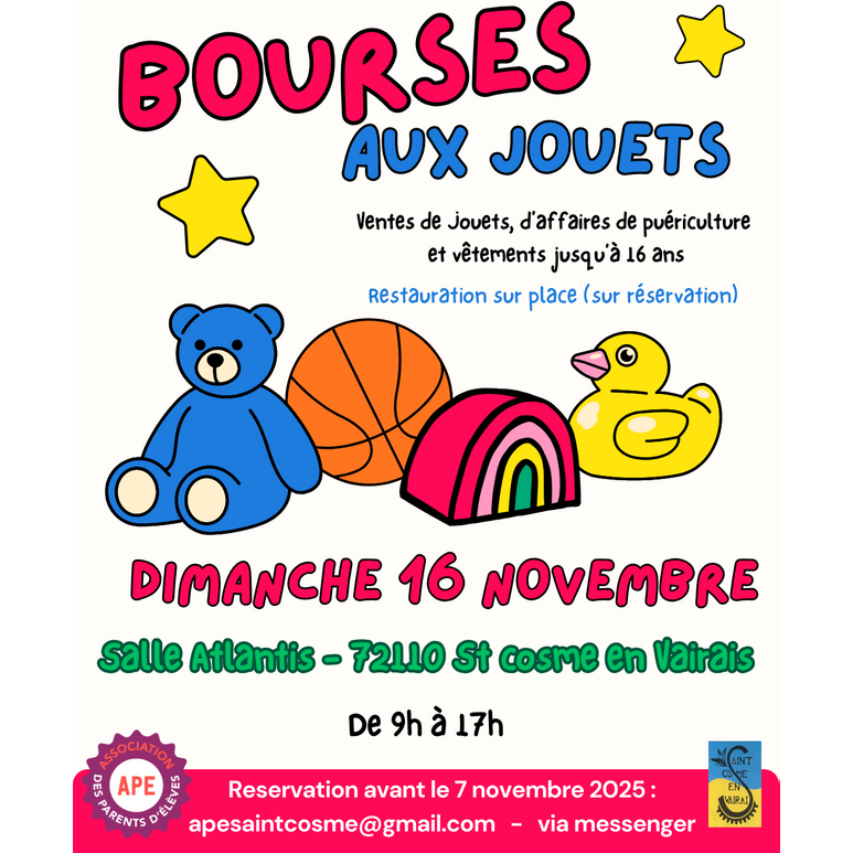 Bourse aux jouets et vêtements organisée par l ape de saint cosme en vairais. Buvette sur place