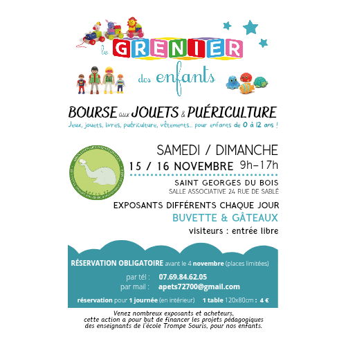 L'APETS (Association des Parents d'Elèves de l'Ecole Trompe Souris) organise Bourse aux jouets et puériculture les samedi 15 et dimanche 16 novembre 2025, de 9h à17h. En intérieur (salle associative de St Georges du Bois- 24 rue de Sablé). 4 euros la table pour une journée (80x120 cm). Réservation obligatoire avant le 4 novembre. Entrée libre pour les visiteurs. Buvette et vente de gâteaux.. Exposants différents chaque jour.