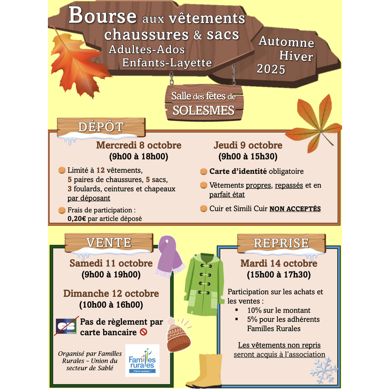 Dépôt les mercredi 9 octobre 2024 (9h-18h) et jeudi 10 octobre 2024 (9h-15h30) - 12 vêtements, 5 paires de chaussures, 5 sacs, 5 foulards, 5 bonnets par déposant muni d'une carte d'identité