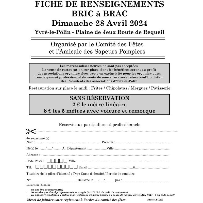 Bonjour le comité des fêtes et l'amicale des pompiers yvré le polin organise un bric a brac a la plaine de jeux