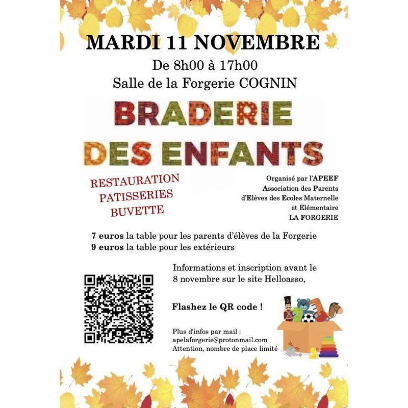 L'association des parents d'elèves des ecoles de la forgerie (apeef) organise une braderie enfants le mardi 11 novembre 2025 à la salle de la forgerie à cognin, de 8h00 à 17h00. Matériel de puériculture, jouets et jeux enfants, habits enfants... Buvette, petite restauration, crêpes, pâtisseries. Braderie en intérieur. Accès libre pour les visiteurs.