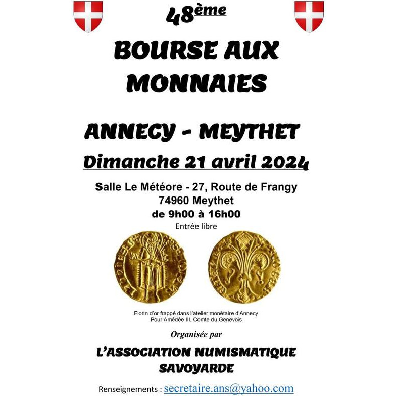 L’association numismatique savoyarde organise son 48ème salon numismatique le dimanche 21 avril 2024 à meythet 74960 (à proximité d’annecy).De 9h à 16h.