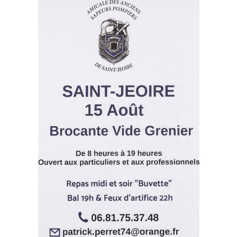 Brocante vide-grenier du 15 août dans le centre du village de saint-jeoire. Ouvert aux particuliers et aux professionnels. Organisé par l'amicale des anciens sapeurs-pompiers.