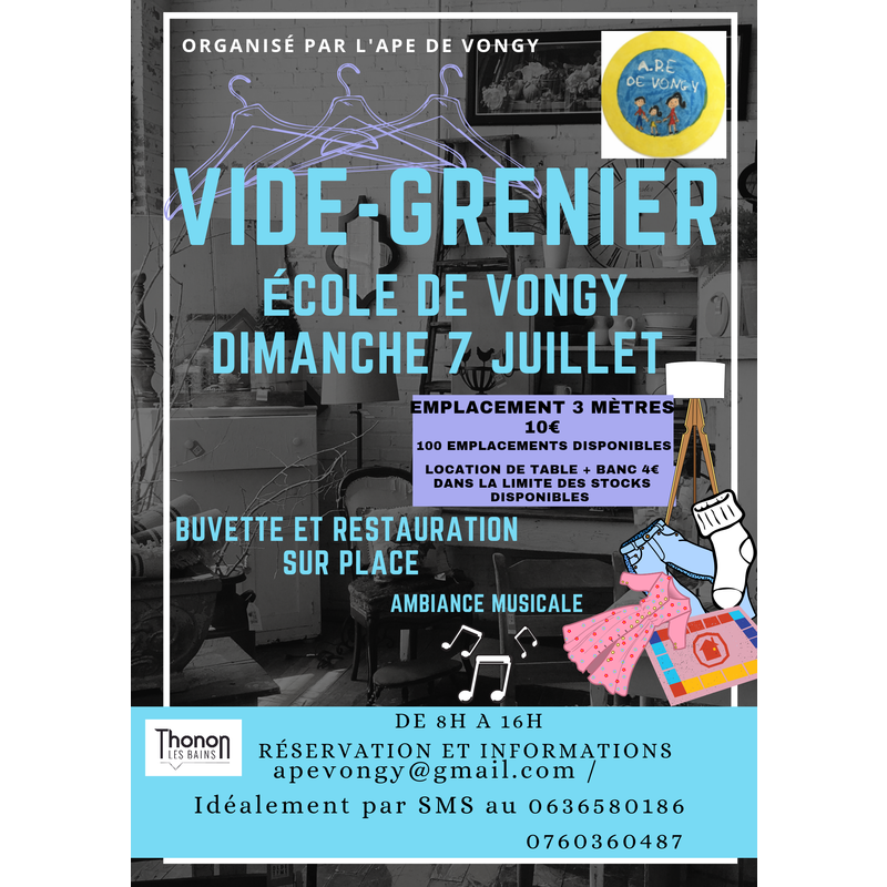 Après notre premier vide grenier l'année dernière qui a affiché complet, voici que nous renouvelons cette année l'expérience à l'école de vongy, cette journée sera basée sur la convivialité et la gaité. Vous serez accueillis par tout nos bénévoles de l'association des parents d'élèves de l'école de vongy pour assurer cette journée dans les meilleur conditions ! Avec une buvette et une restauration sur place.