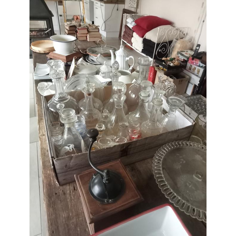 vaisselles anciennes sarreguemines, services vaisselle en gré, carafes cigogne avec plateau et ses verres, théières, anciennes tasses avec soucoupe, saucières, cruches, vases, lustre en laiton,, ancienne suspension, accessoires de cheminée, cadres, cadre religieux, collier de cheval, ancien moulin à poivre ou café, livres, guide michelin 1966, missels + images , crucifix, poterie en terre, cartes brodées, livres sur la guerre, paniers en osier
