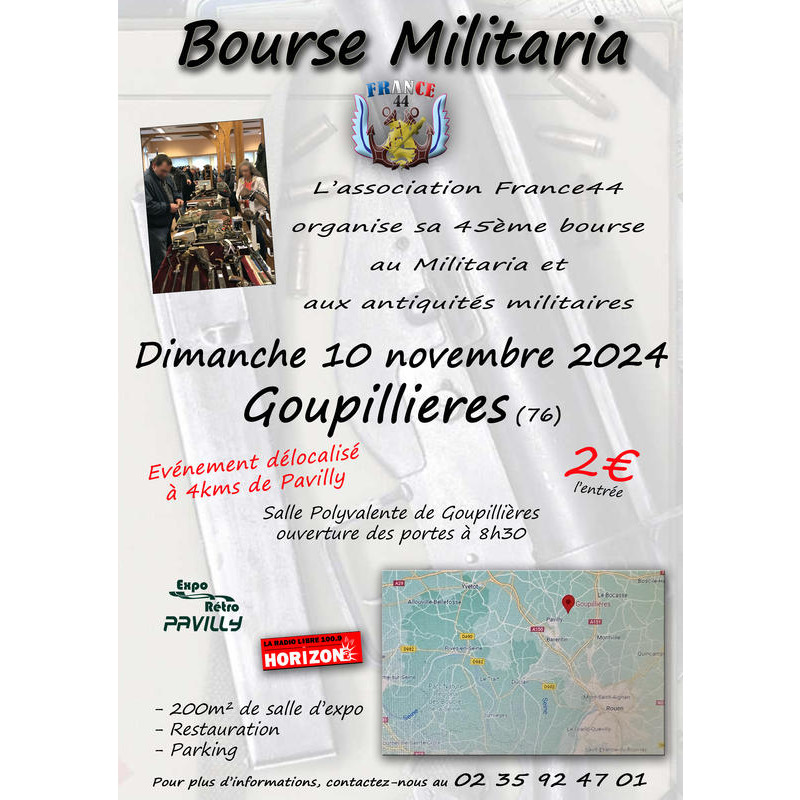 L'association france 44 organise sa 45ème bourse au militaria le dimanche 10 novembre 2024 à la salle des fêtes de goupillieres (76) à 4 km de pavilly