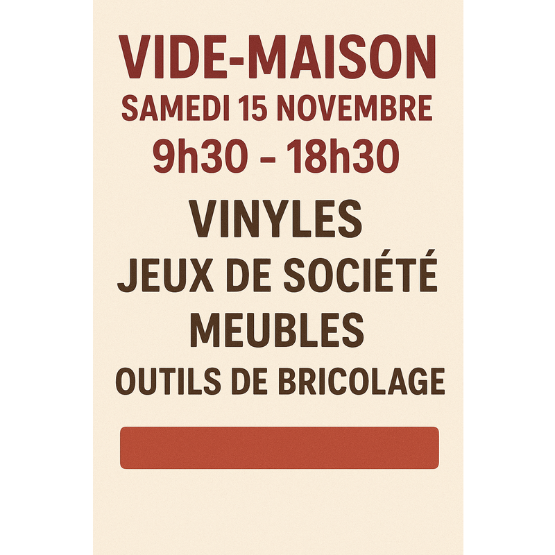 venez faire de bonnes affaires lors de notre vide-maison ce samedi 15 novembre ! Nous vous proposons des meubles, des objets de décoration, des livres, des vinyles, outils. C'est l'occasion rêvée de dénicher des trésors tout en donnant une seconde vie à des objets.