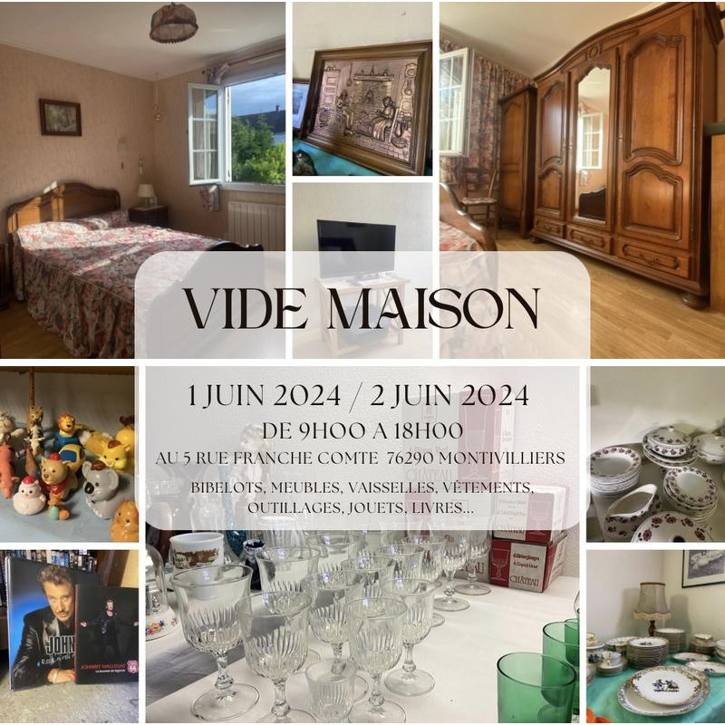 Vide maison avec bibelots, vaisselles, jouets, cadres, tableau, livres, linge de table, meubles....