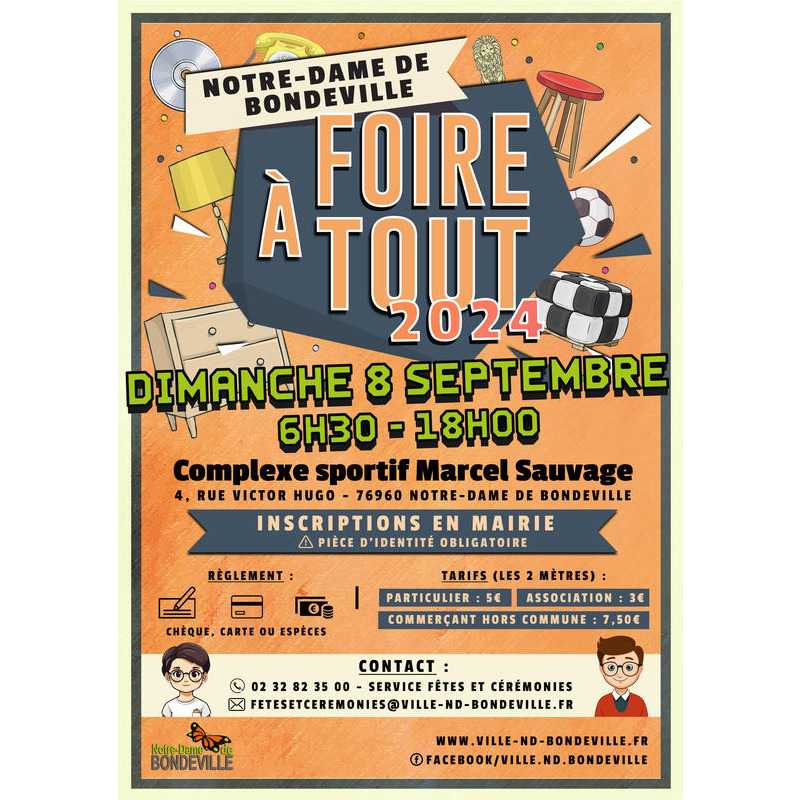 Dimanche 8 septembre 2024, c'est le retour de notre traditionnelle foire à tout à notre-dame de bondeville ! Une journée pour vendre ou dénicher de bonnes affaires, passer un bon moment entre amis, en famille... À la buvette et en restauration. Une superbe journée de convivialité en votre compagnie !