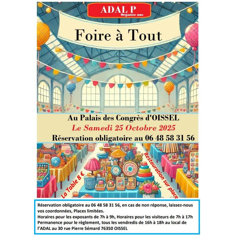 Nous organisons une « foire à tout » le samedi 25 octobre 2025 au palais des congrès d’oissel.