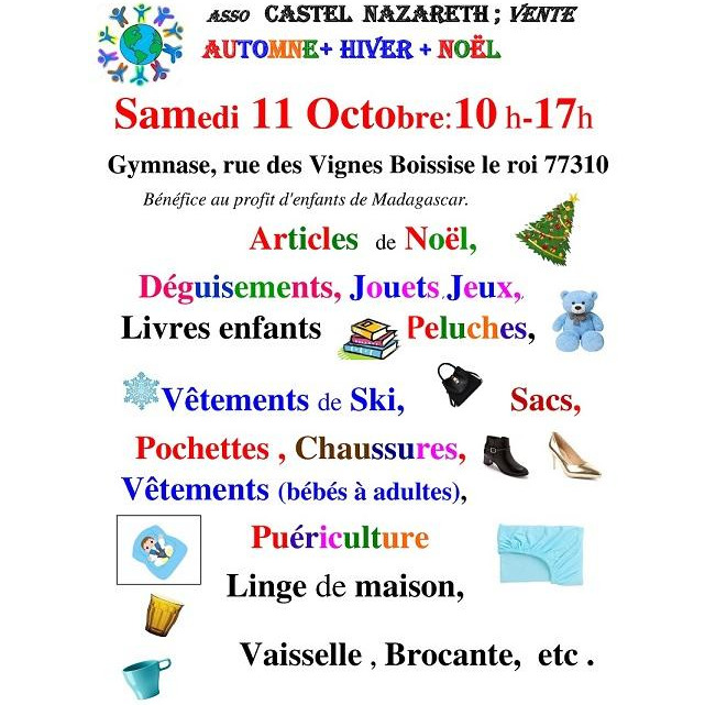 samedi 11 octobre de 10 h à 17 h gymnase , rue des vignes boissise le roi 77310 . But humanitaire ( aide aux orphelinats de madagascar ) et anti-gaspi ( 2eme vie aux articles )