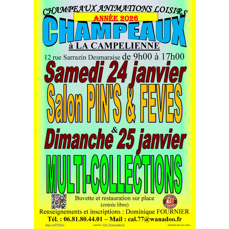 Champeaux animations loisirs organise, le samedi 24 janvier 2026, le 22ème salon du pin’s à champeaux (77). Cette manifestation, seule exposition d’ile-de-france et l’un des 3 derniers salons nationaux, se déroulera à la salle des fêtes (la campélienne), toute la journée.