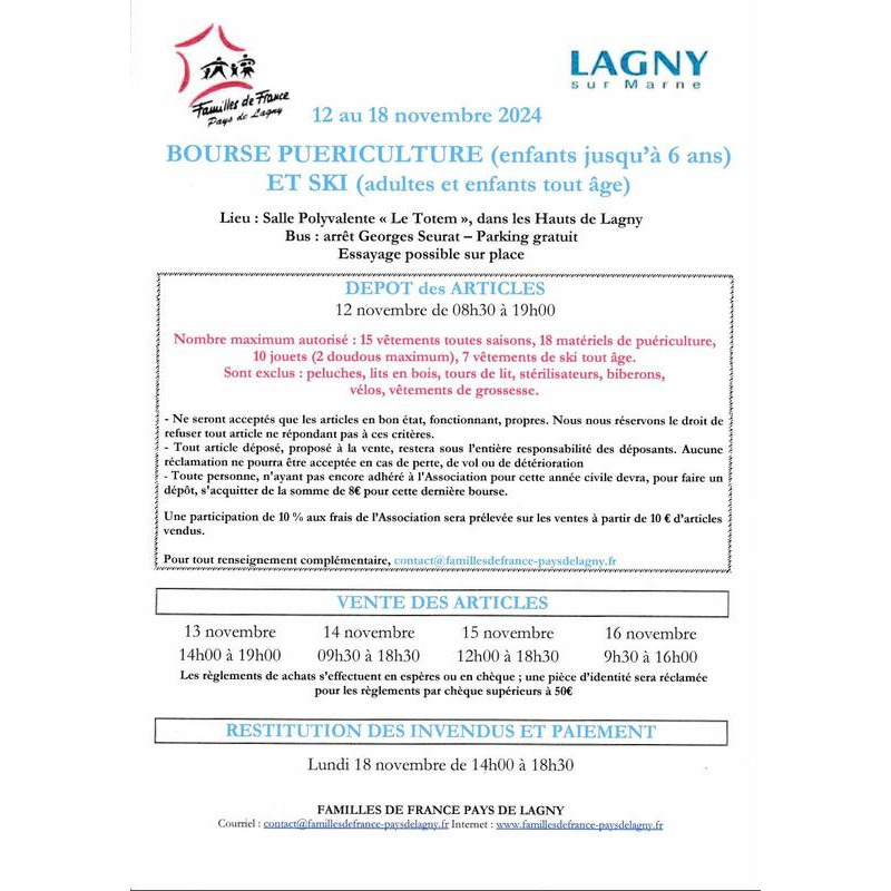 Bourse ou vous trouverez en occasion tout pour la puériculture et les vêtements enfants jusqu'à 5 ans. Il y aura aussi des jouets 1er âge et des vêtements de ski enfants et adultes. Tout en très bon état car trié avant les dépôts. Pour les horaires d'ouverture, voir sur l'affiche. Ce n'est pas ouvert aux mêmes horaires tous les jours.