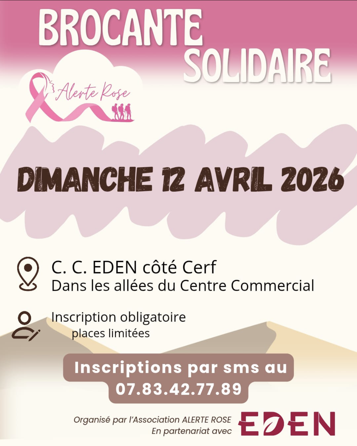 Brocante organisée par l'association Alerte Rose, au Centre Commercial Eden coté cerf. Elle aura lieu sur les allées du centre commercial extérieur.
