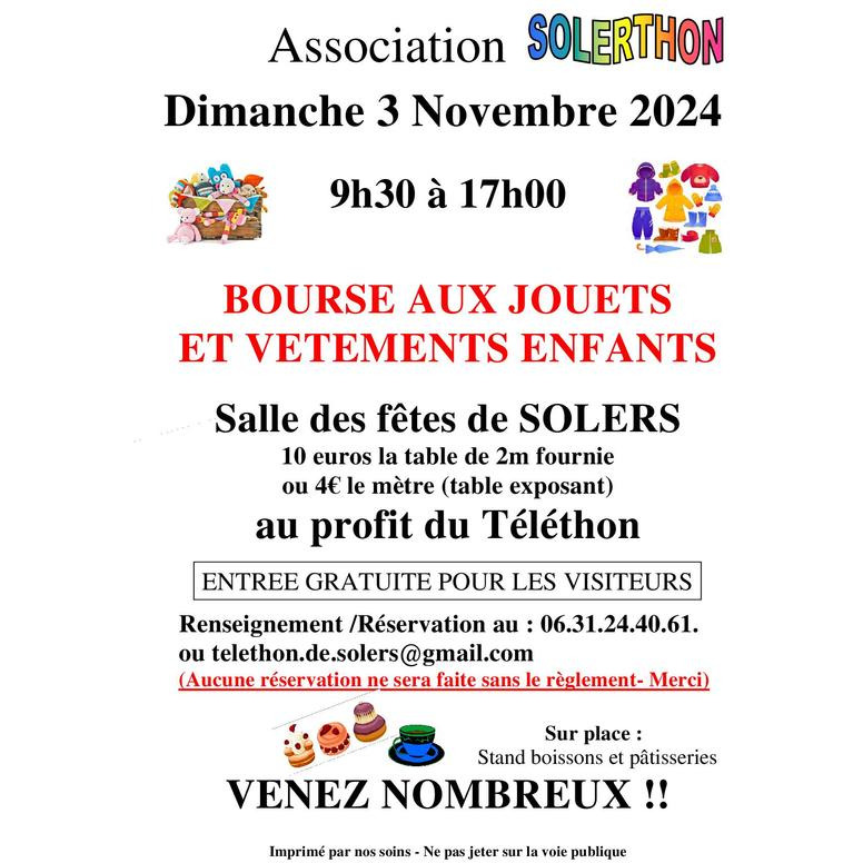 Dans le cadre du téléthon, présent dans notre village depuis 24 ans, l’association solerthon organise sa bourse aux jouets et vêtements enfants le dimanche 3 novembre à la salle des fêtes de solers, place de la mairie.