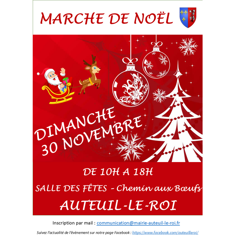 La mairie d’auteuil-le-roi organise son traditionnel marché de noël le dimanche 30 novembre 2025 de 10h à 18h à la salle des fêtes située chemin aux bœufs. Des commerçants et artisans locaux seront présents pour vous présenter leurs produits et prendre vos commandes pour les festivités de noël.