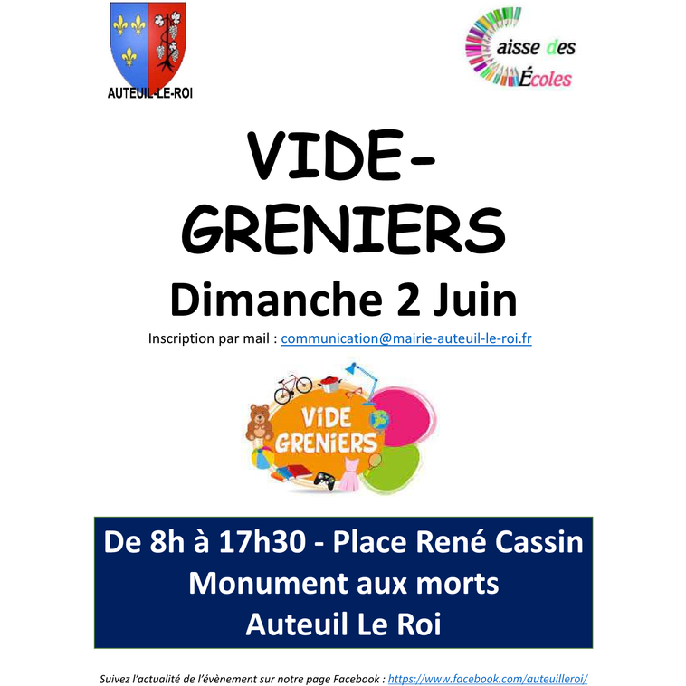 La caisse des écoles organise un vide-greniers le dimanche 2 juin 2024 de 8h à 17h30 sur la place rené cassin, rue de l’eglise.