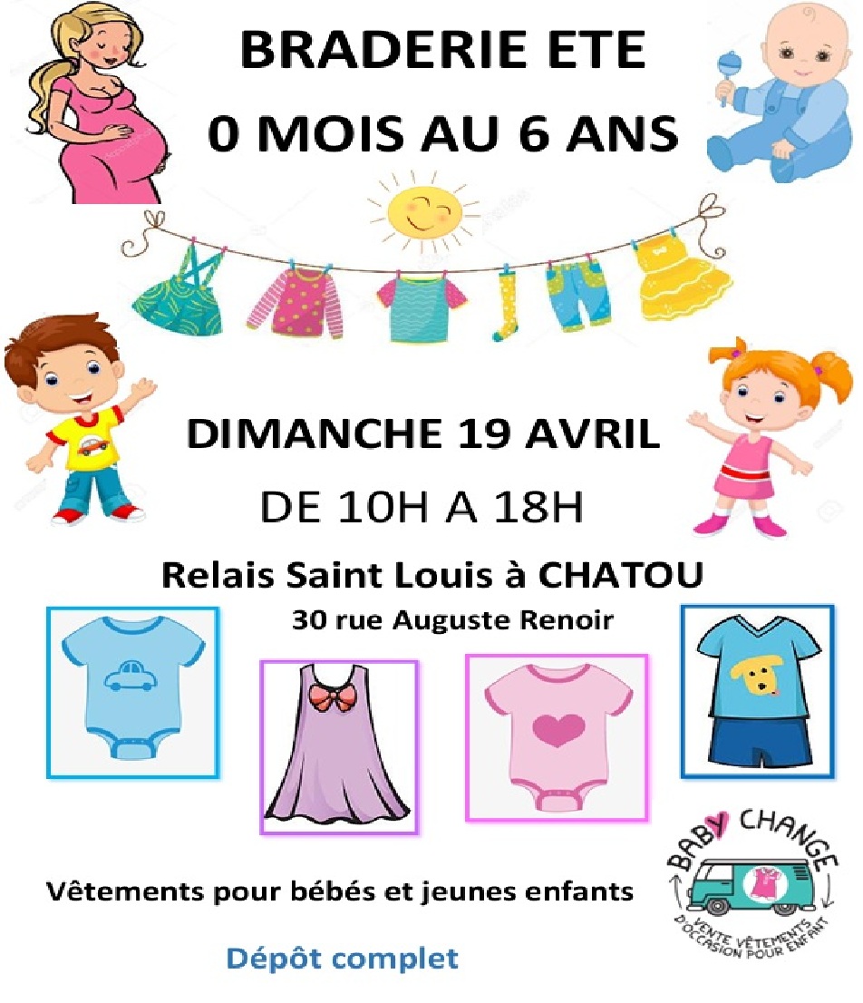 La braderie printemps/été pour jeunes enfants (du 0 mois au 6 ans), se tiendra le dimanche 19 Avril au Relais Saint Louis : 30 bis rue Auguste Renoir. Il y aura plus de 2500 pièces à petits prix et en parfait état…