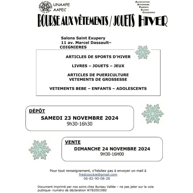 Vêtements pour bébés, enfants et ados, articles de sport d'hiver, livres, jeux, jouets, puériculture.