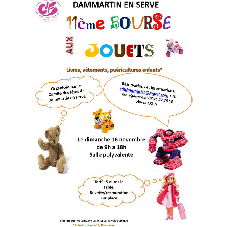 11eme bourse aux jouets (livres, jeux, vetements et articles de puericulture) organisée par le comité des fetes de dammartin en serve (78111) a la salle des fetes le dimanche 16 novembre 2025.
