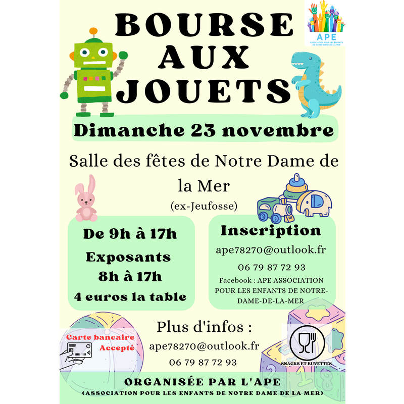 l'association ape organise une bourse aux jouets le dimanche 23 novembre 2025 dans la salle des fêtes de notre-dame-de-la-mer.