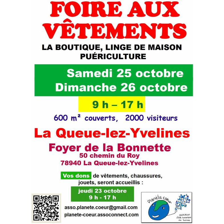 Vente de vêtements adultes et enfants, jeux et jouets, maroquinerie, linge de maison au profit de l'association planète coeur, association humanitaire des yvelines