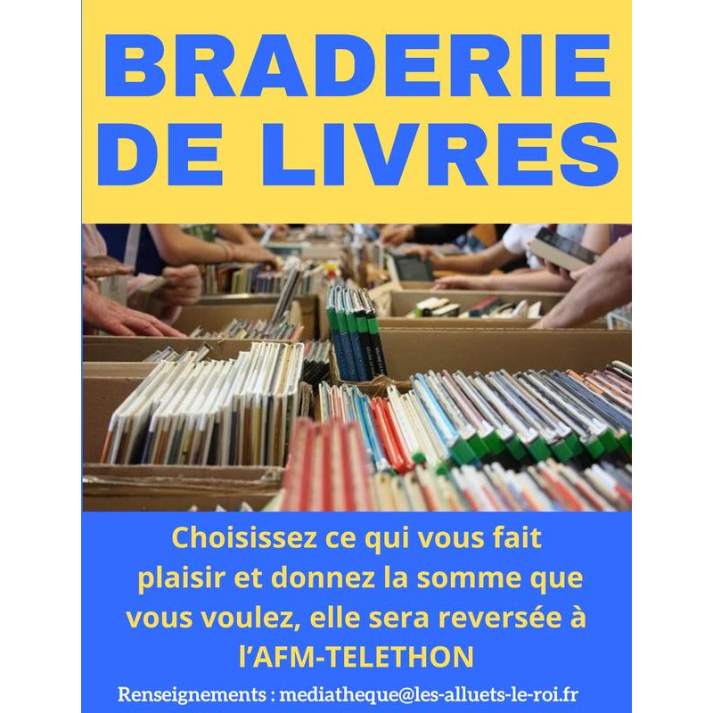 Braderie de livres de tous genres : romans, jeunesse, bd, mangas, albums, revues... Par la médiathèque des alluets-le-roi au profit du téléthon.