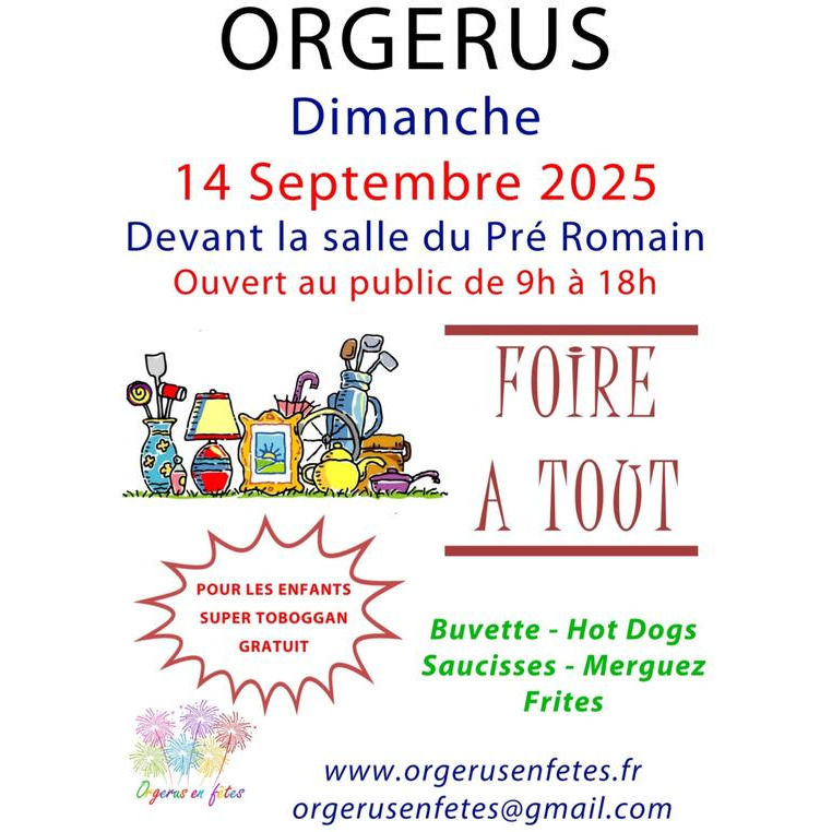 À vos agendas foire a tout gratuit : " super toboggan pour les enfants " www.orgerusenfetes.fr restauration et buvette : saucisses/merguez frites hot-dog / sandwichs gâteaux et crêpes *** paiement en espèces et cb ***